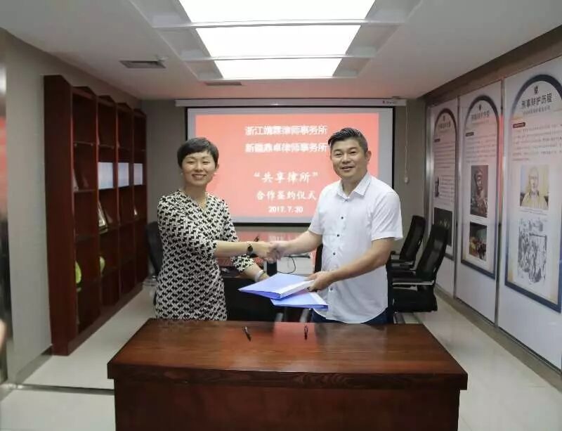 2017年7月30日,浙江靖霖律师事务所主任徐宗新、新疆鼎卓律师事务所主任肖翠平共同完成了“共享律所”合作签约仪式。